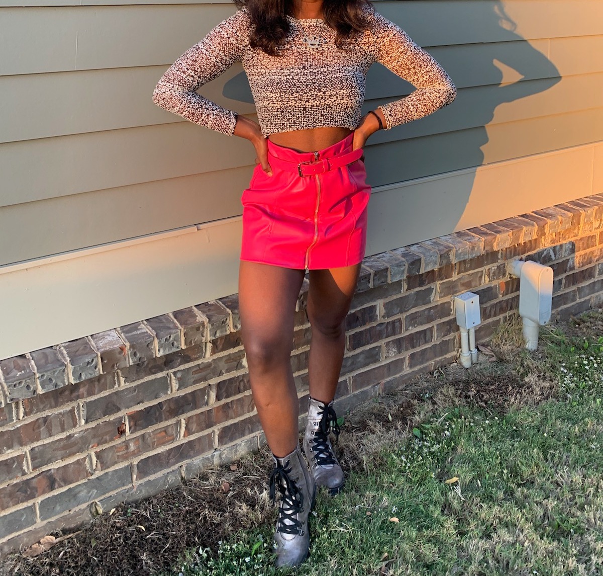 This crop top I used is a mesh top in a paisley print which makes it a great transitional piece for any season. I left it simple with the skirt, but on this outfit, you can add a black or pink matching jacket if it’s cold, or a t-shirt over top for layering. For shoes I decided to go a little grungy to offset the girly flowers on the top half, looking a unique aesthetic.