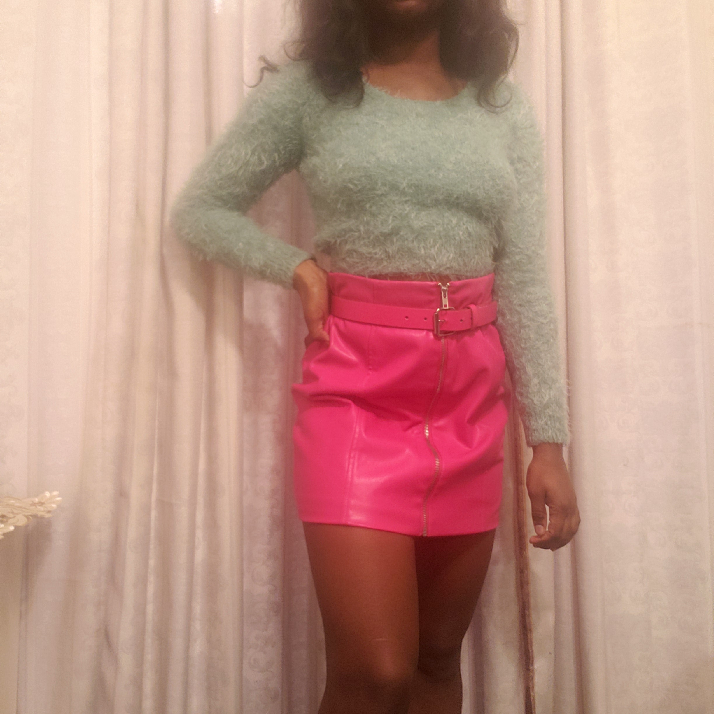 The skirt is already a heavy leather texture, but this mint mohair crop top not only balances out the amount of skin showing, but it is a more elevated look for a night out than a plain t-shirt couldn’t do.