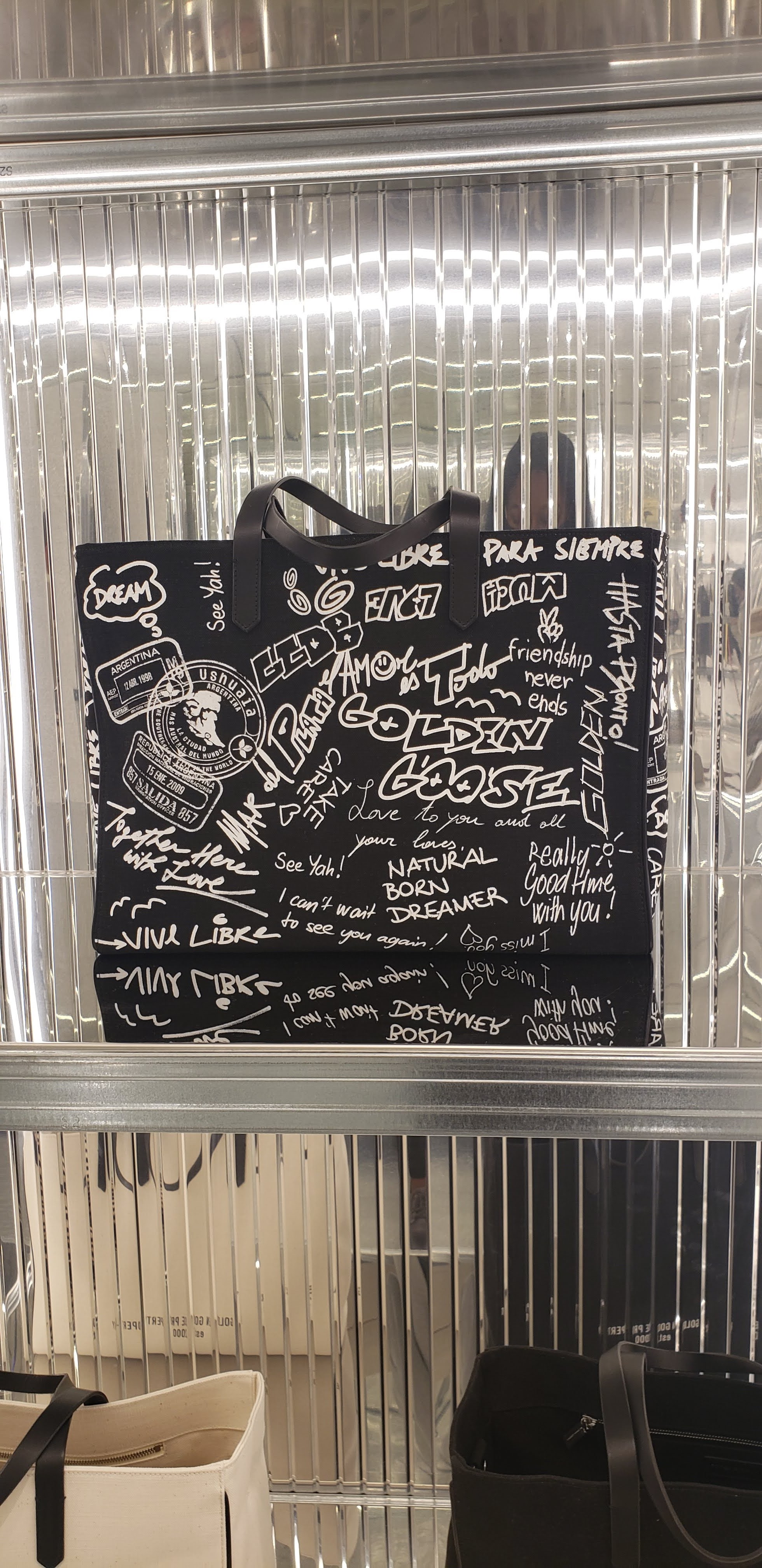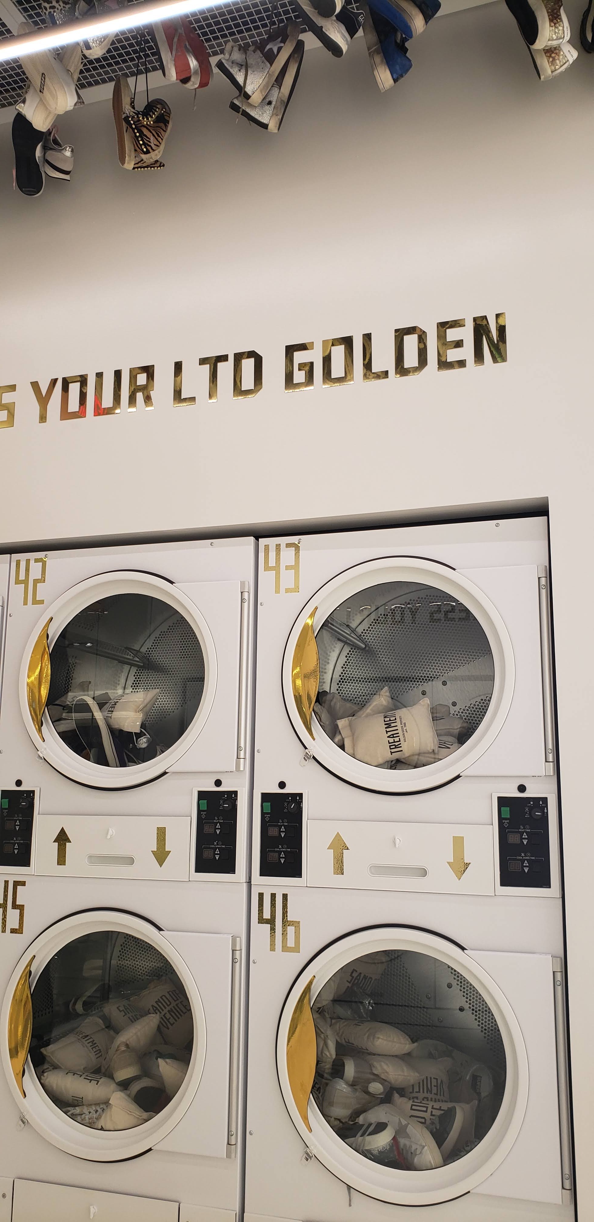 I walked past this store and saw sneakers in a laundry dryer out of my peripheral vision. I’m a suckered for weird visual merchandising so I waltz in. The lovely sales associate, now aware of my rose-colored ignorance gave me a debrief of this brand, Golden Goose, and the vision. Golden Goose was founded in 2000 by two married Italian designers who wanted to take home a piece of their experiences around the world and implement it in their products to create an artisan focused lifestyle brand. Signature GG details are pre-scuffed sneakers, metallic textiles, and colors scraps of leather and other miscellaneous materials used to create a one of a kind sneaker design for the customer. A few select stores (i.e. the Houston Galleria I was at) have a lab where an artisan can customize your sneaker for you. Most of the sneakers in their collection are to only manufacture ansell in the hundreds and sell and then they aren’t manufactured again.